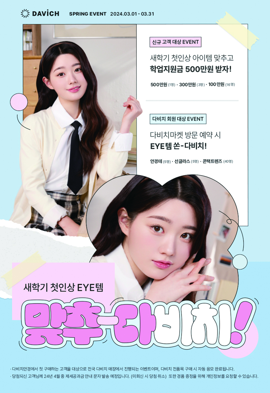 이번 ‘맞추-다비치’ 프로모션은 다비치안경이 신학기 등 새출발하는 모든 학생들과 학부모를 응원하는 마음을 전하기 위해 기획된 행사다.
