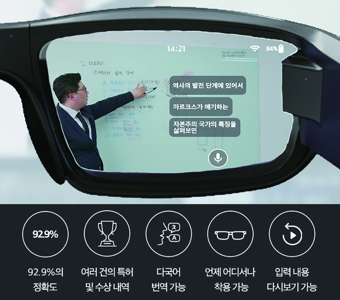 ‘씨사운드’는 상대방의 음성을 실시간 글자로 보여주는 스마트 안경으로 청각장애인들의 의사소통을 지원하는 보조기기다. 청력 손실로 학교 수업이나 직장생활 등의 일상생활이 불편했던 청각장애인들의 불편함을 해소할 수 있다.