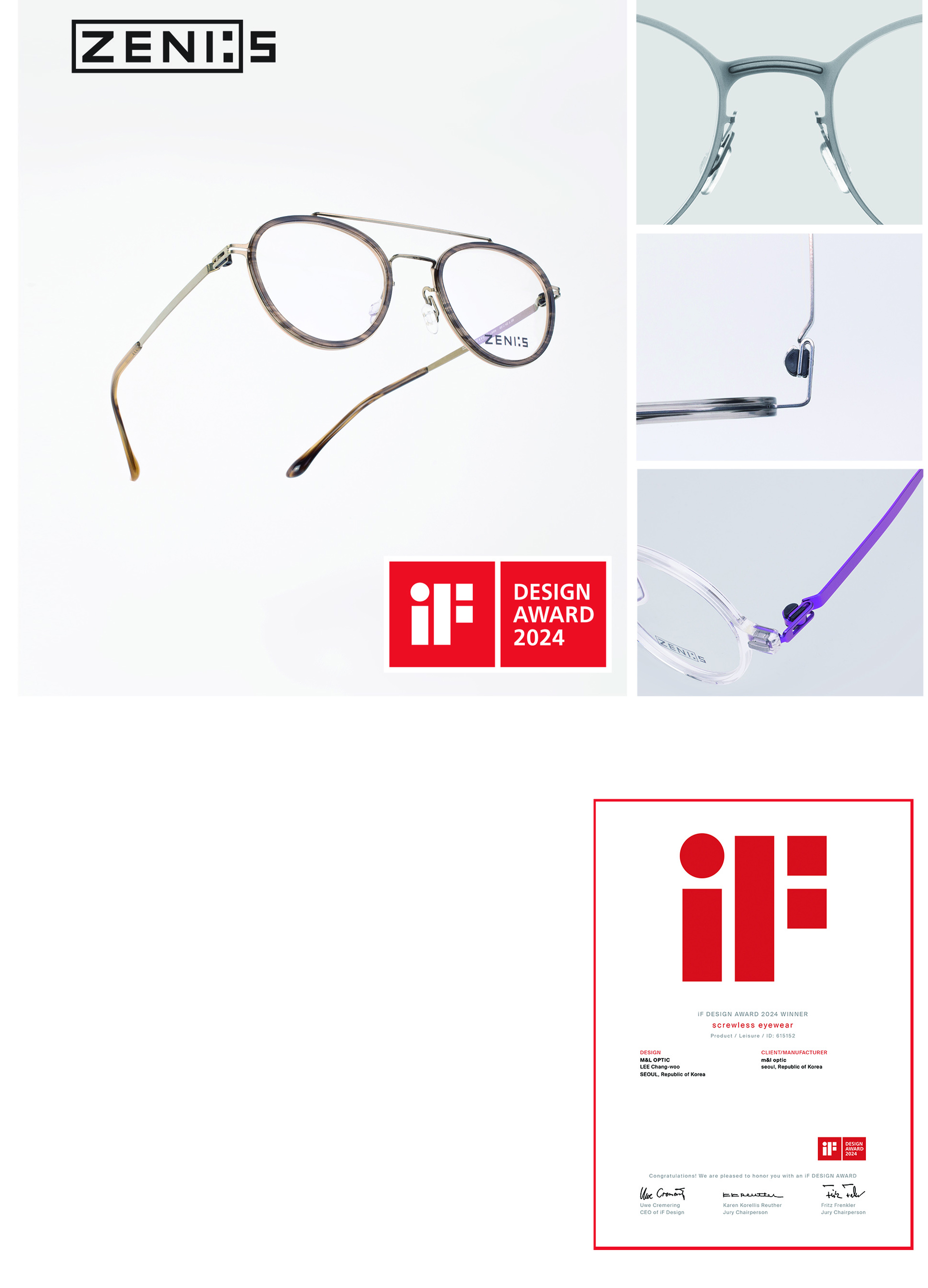 독자적인 아노다이징 기술을 통해 세상에 없는 컬러감을 구현해내고 있는 제니에스(ZENI:S)가 세계적 권위의 디자인 어워드인 ‘iF디자인 어워드 2024’에서 제니에스 SCREWLESS EYEWEAR로 ‘프로덕트 앤 레져’ 부문 본상을 수상했다고 최근 밝혔다.