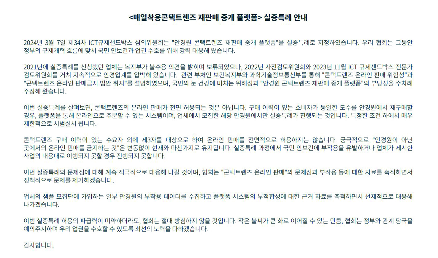 대안협은 “2024년 3월 7일 제34차 ICT규제샌드박스 심의위원회는 ‘안경원 콘택트렌즈 재판매 중개 플랫폼’을 실증특례로 지정하였습니다. 우리 협회는 그동안 정부의 규제개혁 흐름에 맞서 국민 안보건과 업권 수호를 위해 강력 대응해 왔습니다. 2021년에 실증특례를 신청했던 업체는 보건복지부가 불수용 의견을 밝히며 보류되었으나, 2022년 사전검토위원회와 2023년 11월 ICT 규제샌드박스 전문가 검토위원회를 거쳐 지속적으로 안경업계를 압박해 왔습니다. 관련 부처인 보건복지부와 과학기술정보통신부를 통해 ‘콘택트렌즈 온라인 판매 위험성’과 ‘콘택트렌즈 온라인 판매금지 법안 취지’를 설명하였으며, 국민의 눈 건강에 미치는 위해성과 ‘안경원 콘택트렌즈 재판매 중개 플랫폼’의 부당성을 수차례 주장해 왔습니다”라고 서두를 뗏다.