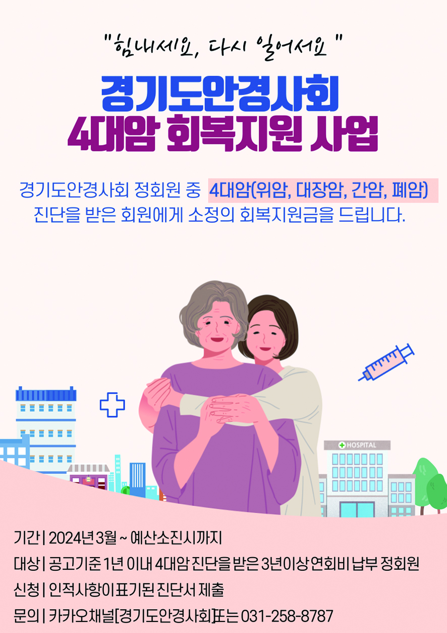 경기도안경사회(회장 윤일영)가 지난해 시범실시한 정회원 4대암 회복지원 사업을 올해도 이어서 진행한다. 해당 사업은 경기도안경사회에서 진행하는 회원 직접사업 일환으로 공고일 기준 최근 1년 이내 위암, 대장암, 간암, 폐암 진단을 받은 정회원에게 소정의 회복지원금을 지원하는 사업이다.