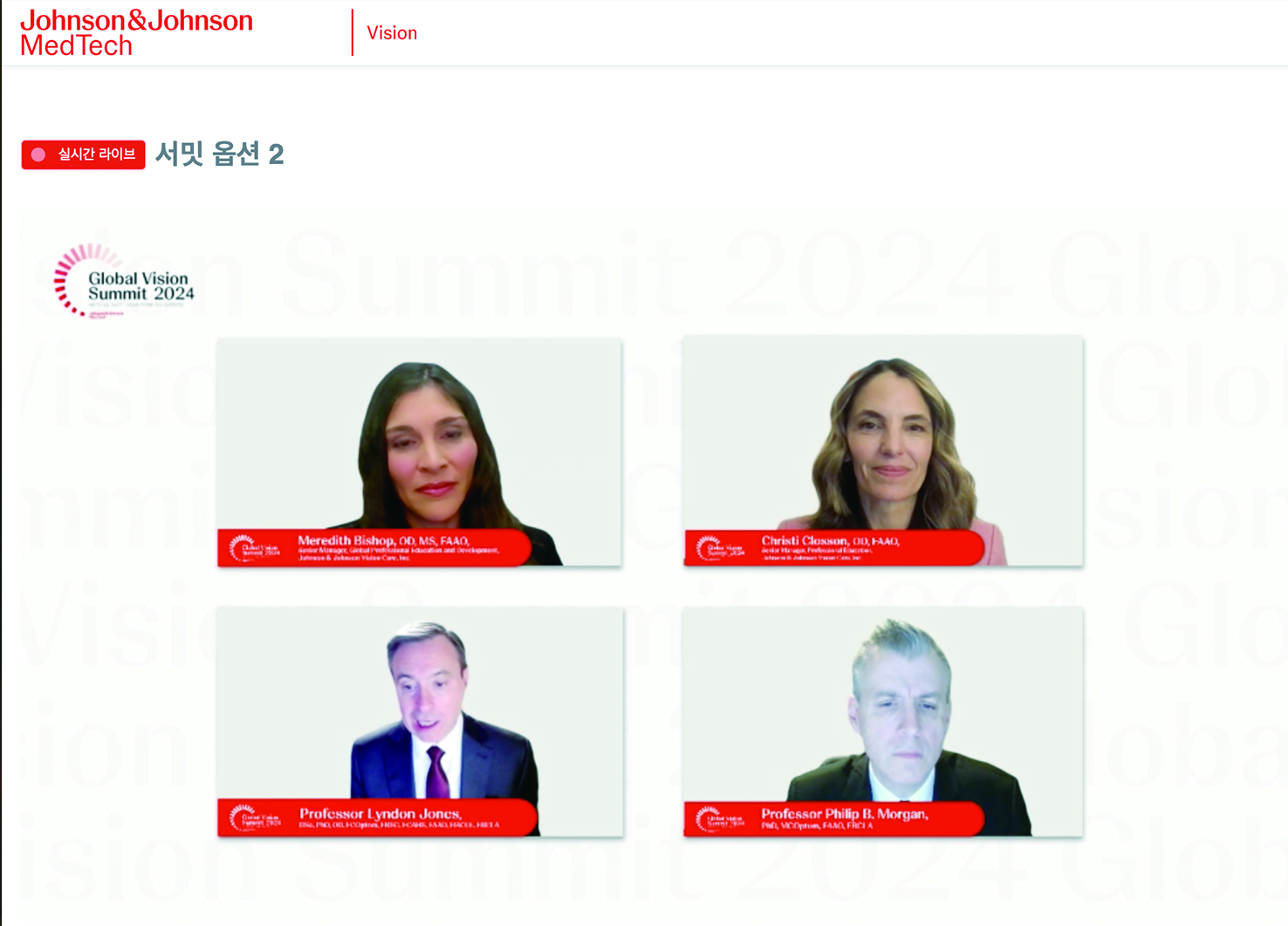 참여한 패널로는 △존슨앤드존슨 비전케어 글로벌 전문 교육 및 개발 선임 관리자 Meredith Bishop OD △존슨앤드존슨 비전케어 선임 책임 연구 검안사 John Buch OD △존슨앤드존슨 비전케어 전문 교육 선임 관리자 Christi Closson OD △캐나다 워털루 대학교 안구 연구 및 교육센터 교수겸 책임자 Lyndon Jones OD △존슨앤드존슨 비전케어 선임 책임 연구원 Patricia Martin △영국 맨체스터 대학교 교수 Philip B. Morgan FAAO 등이 참석했다.
