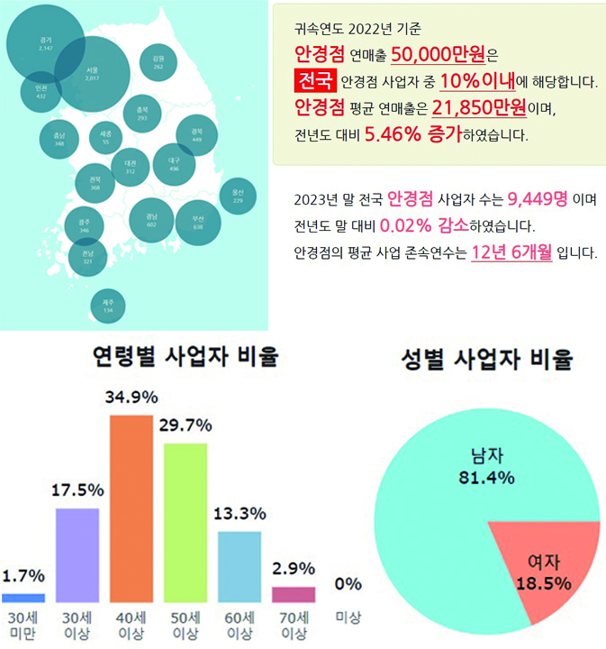 그렇다면 사업자 안경원 사업자 성별 비율은 어떻게 될까. 안경원 남자 사업자가 81.4%, 여자 사업자가 18,5%로 확인이 됐다. 연령별 사업자 비율은 40세 이상이 34.9%, 50대 이상이 29.7%, 30세 이상은 17.5% 60세 이상이 13.3%로 40세에서 50세 사이의 안경원 사업자 원장이 가장 많은 것으로 확인이 됐다.