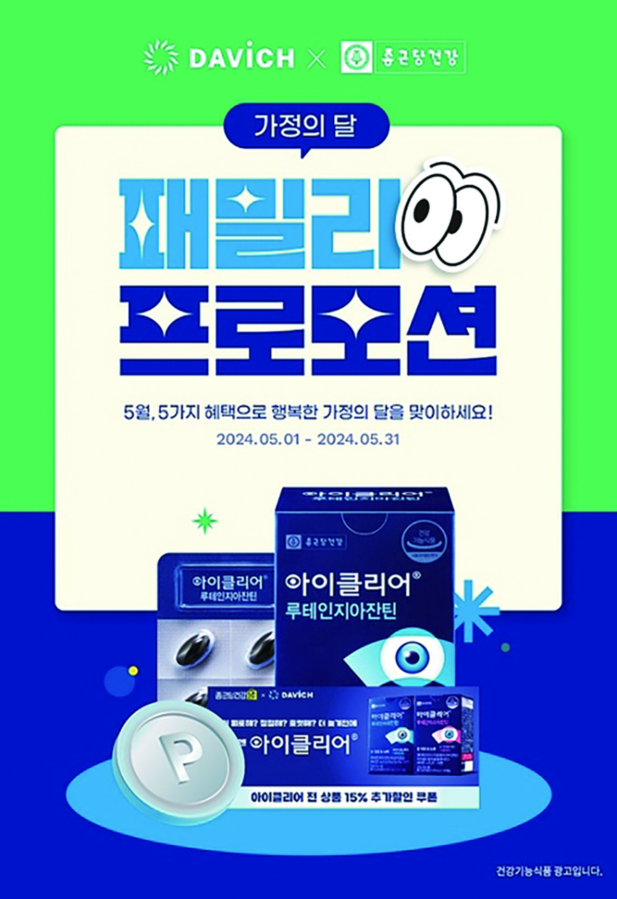 올해는 온 가족의 눈 노화 케어를 위해 종근당건강 ‘아이클리어’와 함께 제휴 프로모션을 진행한다. 먼저, 사은품 소진 시까지 유행에 구애받지 않고 오랜 시간 착용할 수 있는 BIBIEM 선글라스 구매 시 종근당건강의 아이클리어 루테인지아잔틴 또는 아이클리어 15% 할인 쿠폰을 증정한다.