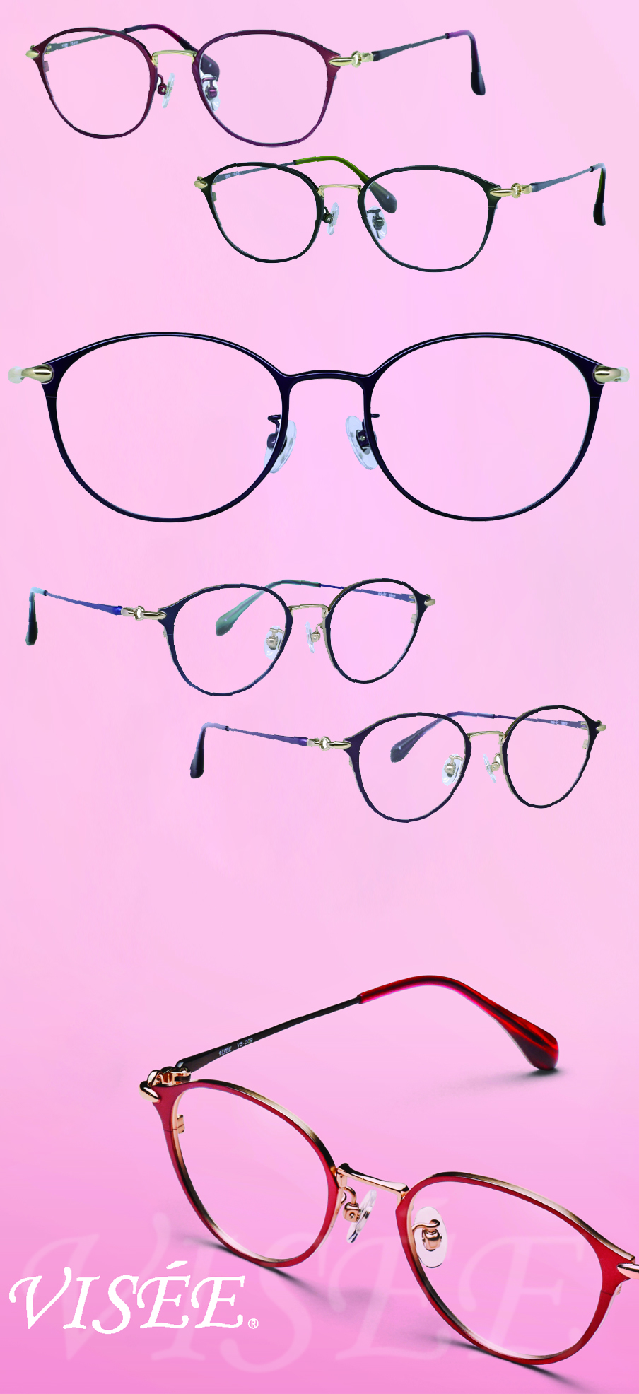 ‘비쎄(Visee)’는 100년 동안 고급 티탄 소재의 안경만 만든 일본의 삼공광학(Sanko Kogaku, since 1923)이 오랜 경험과 노력을 바탕으로 제작된 여성용 최고급 티타늄 패션 안경 브랜드로 최고의 품질과 섬세한 디테일을 자랑한다. 일본의 장인정신에 고급스럽고 품격 있는 컬러와 최고급 코팅, 심플하고 클래식한 디자인과 가볍고 튼튼한 최고급 티타늄 소재의 편안한 착용감으로 꾸준히 사랑받고 있다.
