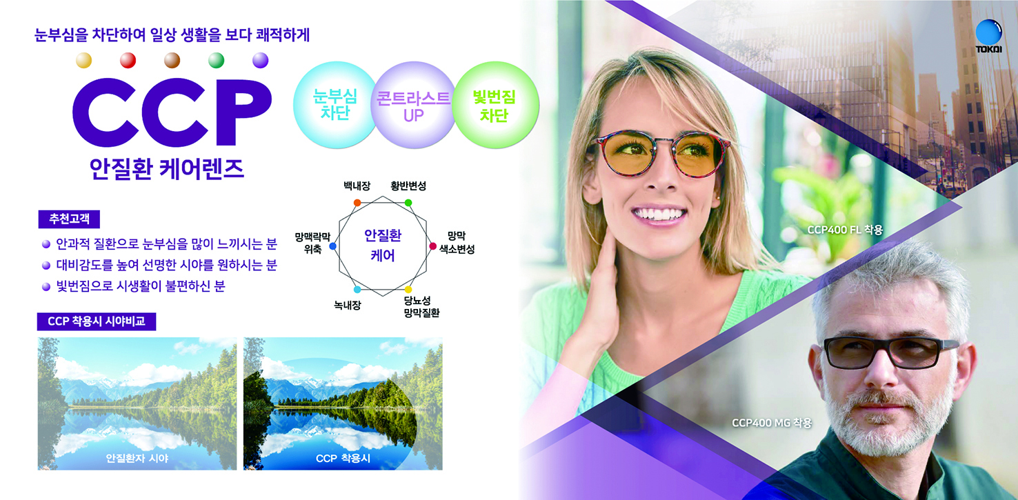 한편 토카이는 루티나 변색렌즈 외에도 안질환 수술 환자들에게 효과가 탁월한 눈부심 케어 CCP 렌즈도 주목받고 있다. 토카이렌즈의 대표적 기술인 특수 염료를 사용한 CCP 렌즈는 눈부심을 유발하는 빛을 선택적으로 차단하는 차광 렌즈다. 일반적으로 전체적인 밝기(조도)를 낮추는 착색 렌즈와 달리 CCP 렌즈는 에너지가 강하며 눈부심을 일으키는 단파장은 차단하고, 선명함을 느낄 수 있는 장파장은 흡수해 효과적인 눈부심 감소와 대비 감도 향상으로 밝고 선명한 시야를 제공한다.