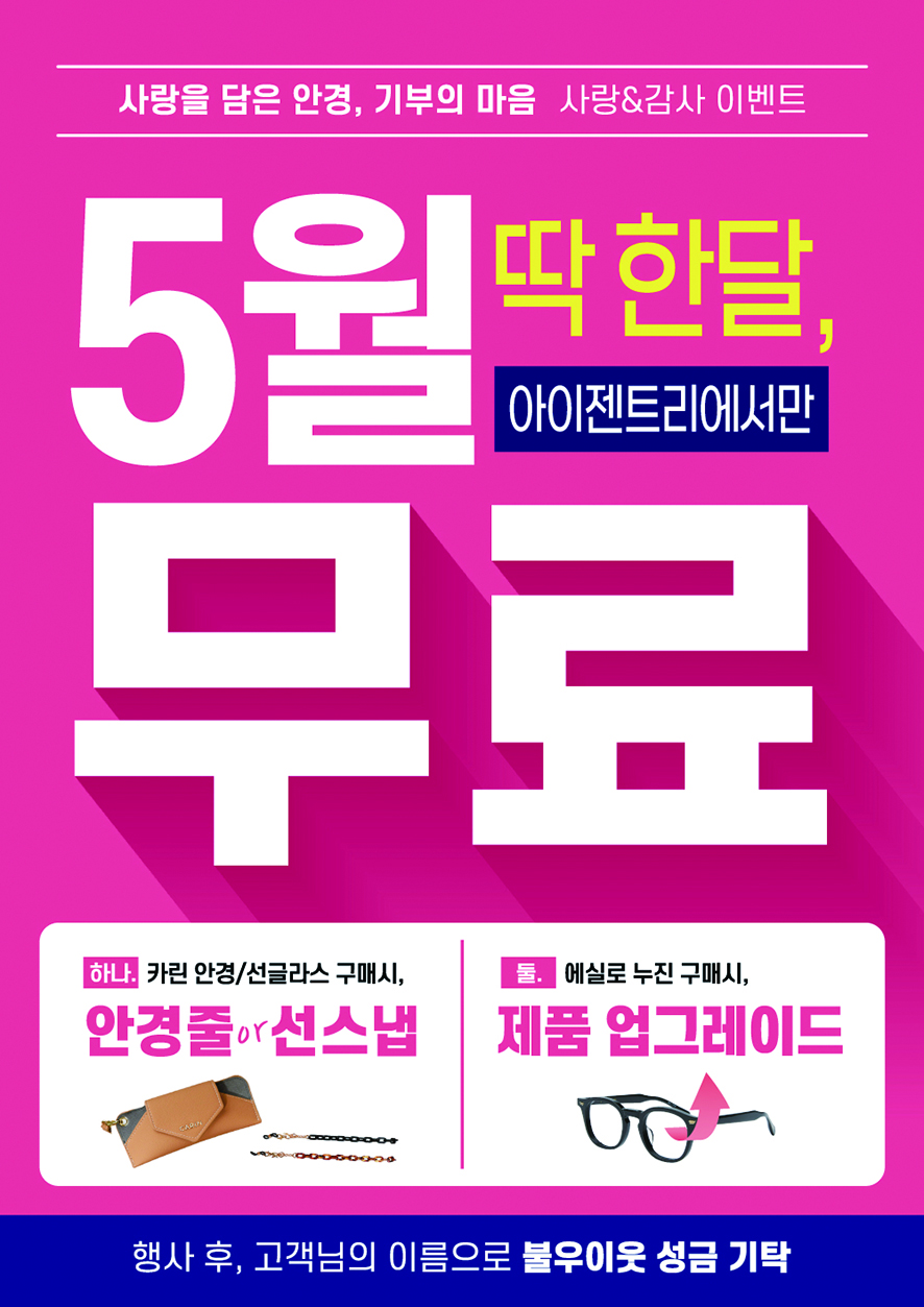 전국 아이젠트리 매장에서 카린 브랜드를 구매한 모든 고객에게 고급 안경줄 또는 선 스냅을 무료로 제공했으며 에실로 누진을 구매한 고객에게는 굴절률을 무료로 업그레이드 하고 있다.