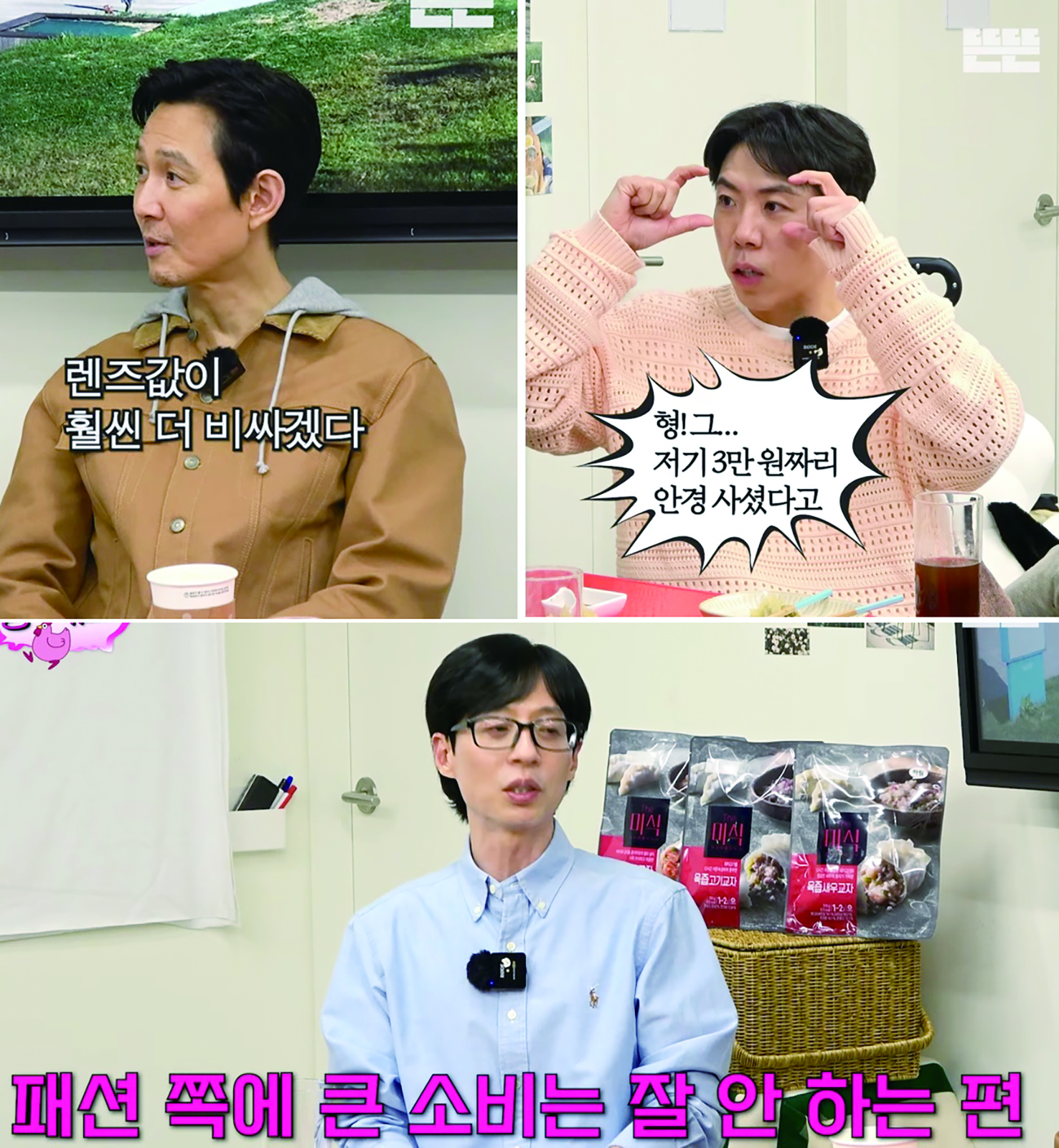 그러다 양세찬이 유재석을 향해 “형 최근에 쿠X에서 안경테 3만원짜리 사지 않았냐”고 물었고 유재석은 “맞아. 지금 착용한 건 만원짜리”라고 답했다. 이어 이정재가 “렌즈가 오히려 더 비싸다”고 덧붙였고 유재석 역시 “맞아. 렌즈가 더 비싸지. 잘 아는구나”라고 대화를 이어갔다.