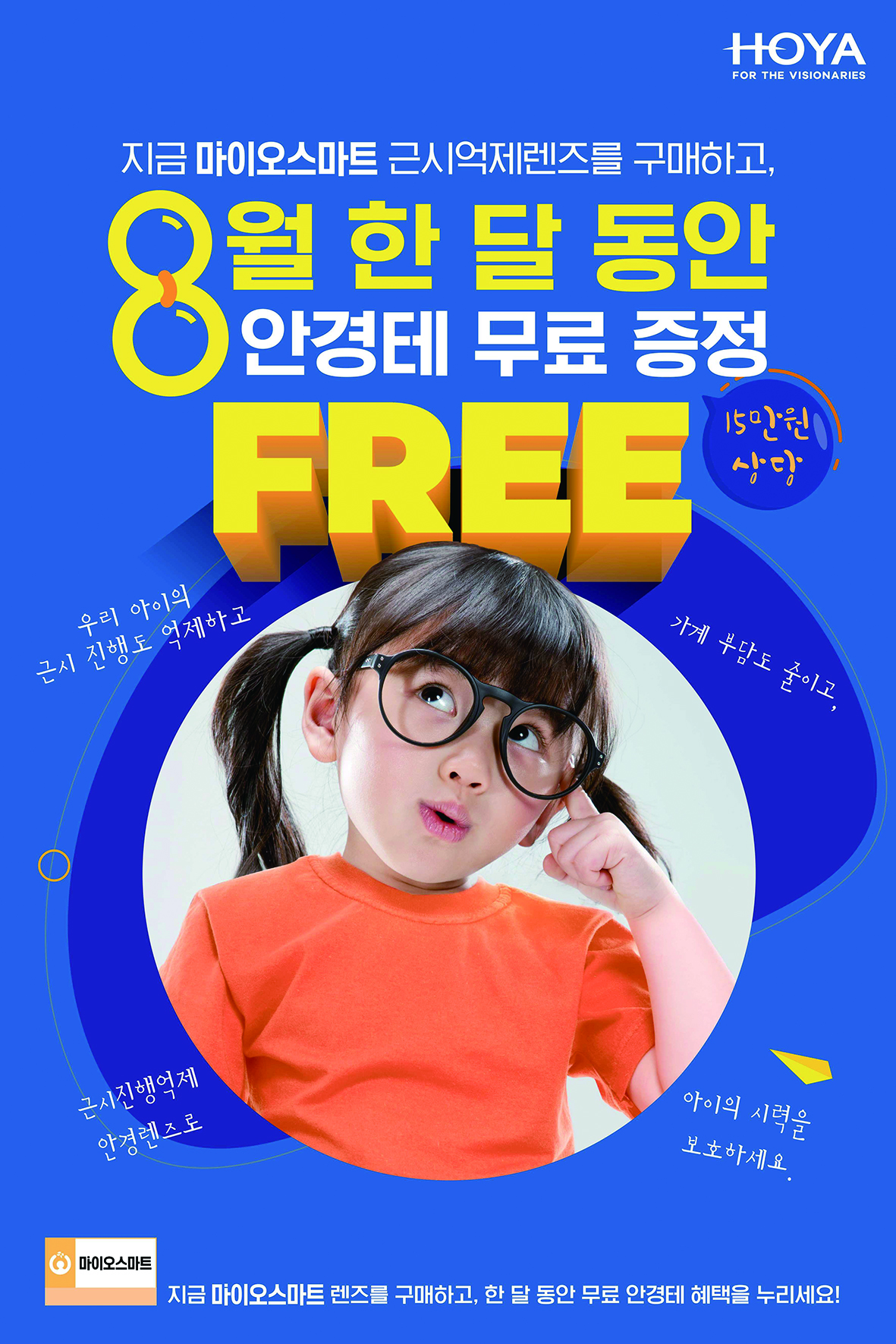 한국호야렌즈(대표 정병헌)가 어린이용 근시 억제 안경렌즈 ‘마이오스마트(MiYOSMART)’ 구매 시 전용 안경테를 무료로 증정하는 ‘나의(My) 스마트(Smart)한 근시 관리 노하우, 마이오스마트’ 이벤트를 8월 한달 간 진행한다고 최근 밝혔다.