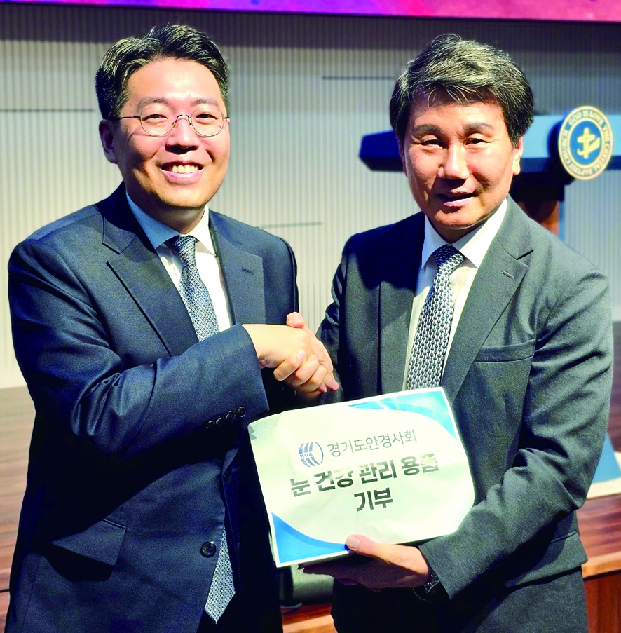 최병갑·윤일영 경기도안경사회 전·현직회장이 지난 4일 수원 소재 수정교회(담임목사 김광호)에 눈건강 관리용품을 전달했다.
