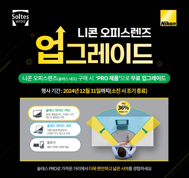 글로벌 안경렌즈 전문 기업 에실로코리아가 오피스 환경에서 눈 피로도가 높은 고객들을 위해 니콘 기능성 안경렌즈 솔테스 와이드 네오 구매 시 솔테스 와이드 PRO로 무료 업그레이드 혜택을 제공한다고 최근 밝혔다. 이번 이벤트는 올해 12월 31일까지 진행된다. (소진 시 조기 종료)