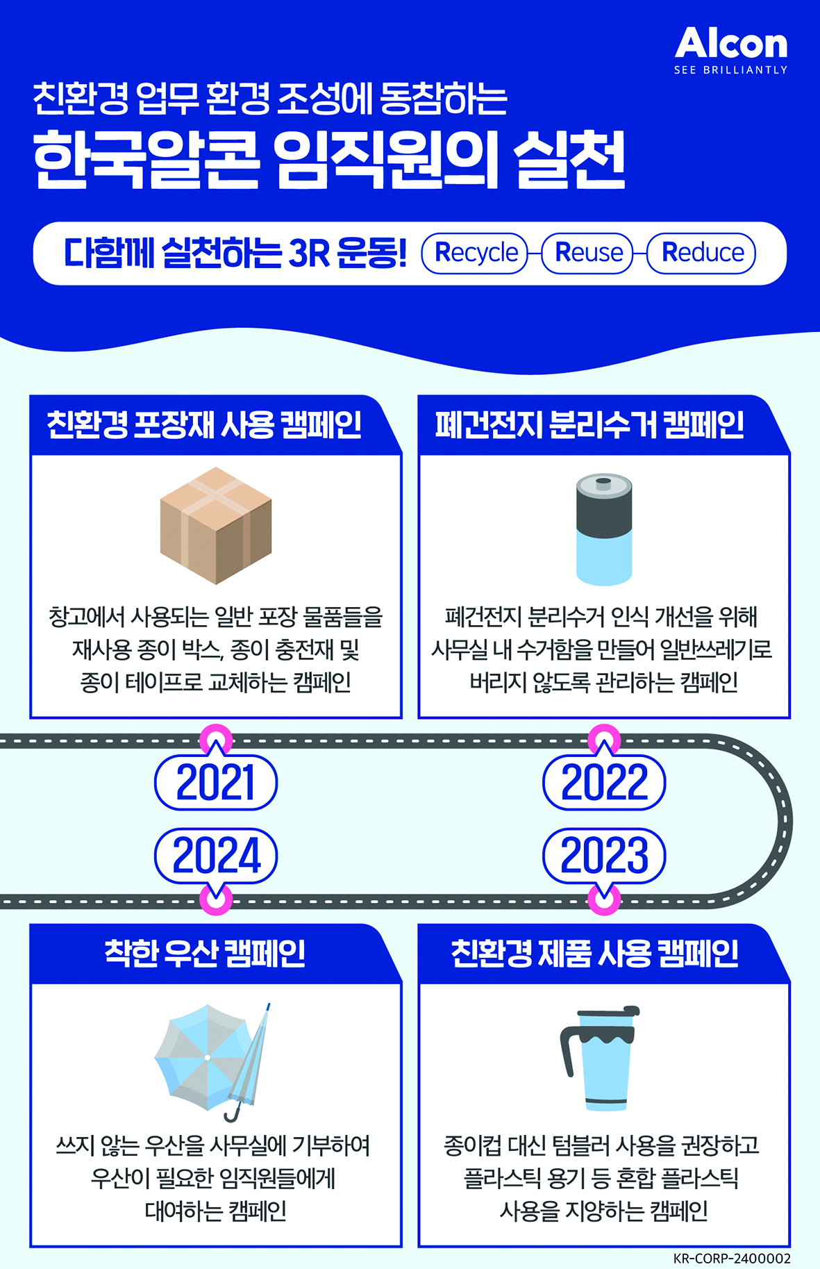 특히 2024년부터 한국알콘은 인공수정체 패키지의 얇은 플라스틱 포장을 제거하고, 제품의 안전성과 무결성을 유지하기 위해 변조 방지 씰로 대체하는 글로벌 이니셔티브에 동참하고 있다.