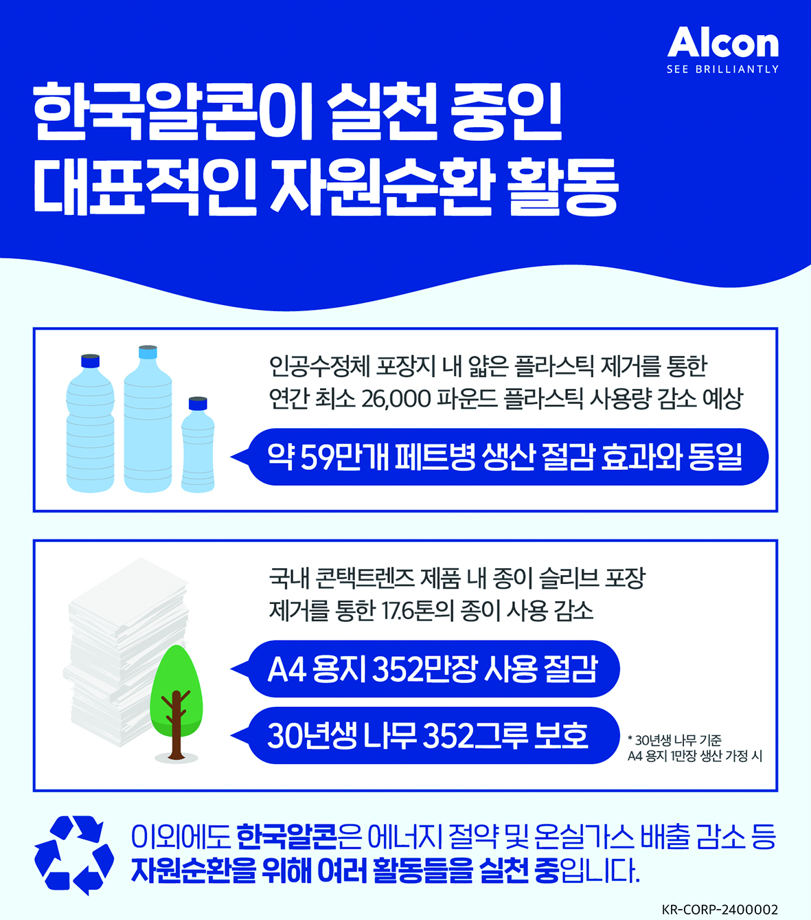 특히 2023년 7월부터 국내에서 판매되는 콘택트렌즈 전 품목에 대해 제품을 감싸고 있는 종이 슬리브 포장을 제거함으로써 종이 포장을 간소화했다. 이는 한국알콘의 단독 이니셔티브(initiative·새로운 계획)로 연간 17.6톤의 종이 사용을 감소시켰으며, 이는 30년 된 나무 352그루를 보존한 것과 같은 효과로 지속 가능의 의미를 더했다.