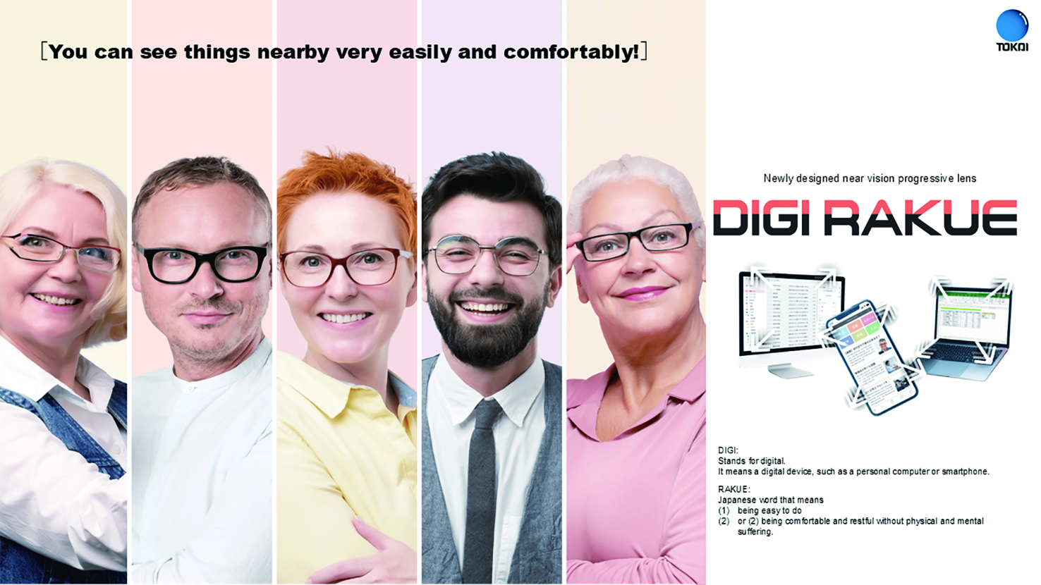 데스크 전용 렌즈 ‘디지라쿠 앤 라르고(DIGI RAKUE&Largo)’는 토카이의 데스크 전용 렌즈로 앉아서 작업하는 모든 거리를 넓고 편하게 볼 수 있는 제품으로 돋보기의 짧은 명시역과 누진렌즈의 좁은 시야를 보완해 착용자의 만족도를 크게 높인 것이 강점이다. 또 SQUARE 설계를 탑재해 좌우 흔들림과 왜곡을 감소시켜줘 근거리 작업 시 피로감을 감소시킬 수 있는 고기능 렌즈로 40대 이상 중장년층에게 높은 인기를 얻고 있는 제품이다.