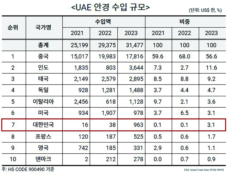 한국무역협회 최신 통계자료에 따르면, 2023년 전체 안경제품 수입액 중 對한 수입액은 96만 달러로 아랍에미리트 전체 수입의 3.1%의 비중을 차지했다. 2023년 한국으로부터의 수입은 크게 늘어 전년 대비 2406% 라는 큰 증가율을 기록하며 대폭 상승했다. 이는 아랍에미리트 안경시장 전체 증가율이 9.7%인 것을 감안하면 괄목할 만한 성장이다.