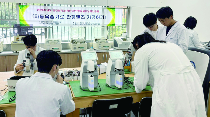 춘해보건대 안경광학과는 E클래스를 통해 동영상을 업로드하고 학생들이 사전에 핵심실무 내용을 충분히 학습할 수 있도록 했으며, 대상자별로 △크로스실린더로 검사하기 △자동옥습기로 안경렌즈 조제가공하기 △콘택트렌즈 착용방법 교육하기 등 총 3개 항목에 걸쳐 역량 평가를 실시했다.