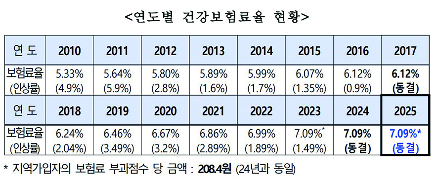 보건복지부는 지난 6일 제17차 건강보험정책심의위원회(위원장 박민수 제2차관)를 열고 2025년도 건강보험료율을 올해와 동일한 7.09%로 결정했다. 이는 역대 4번째 보험료율 동결이며 2년 연속 보험료율 동결은 처음이다.