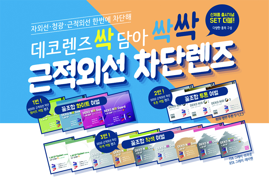 데코 근적외선 차단렌즈는 근적외선 차단 코팅, 초발수 코팅으로 화이트 여벌, 착색 여벌 품목은 물론, 국내 최초로 NIR 투톤 평면 여벌 등 다채롭게 구색을 갖추고 있다.