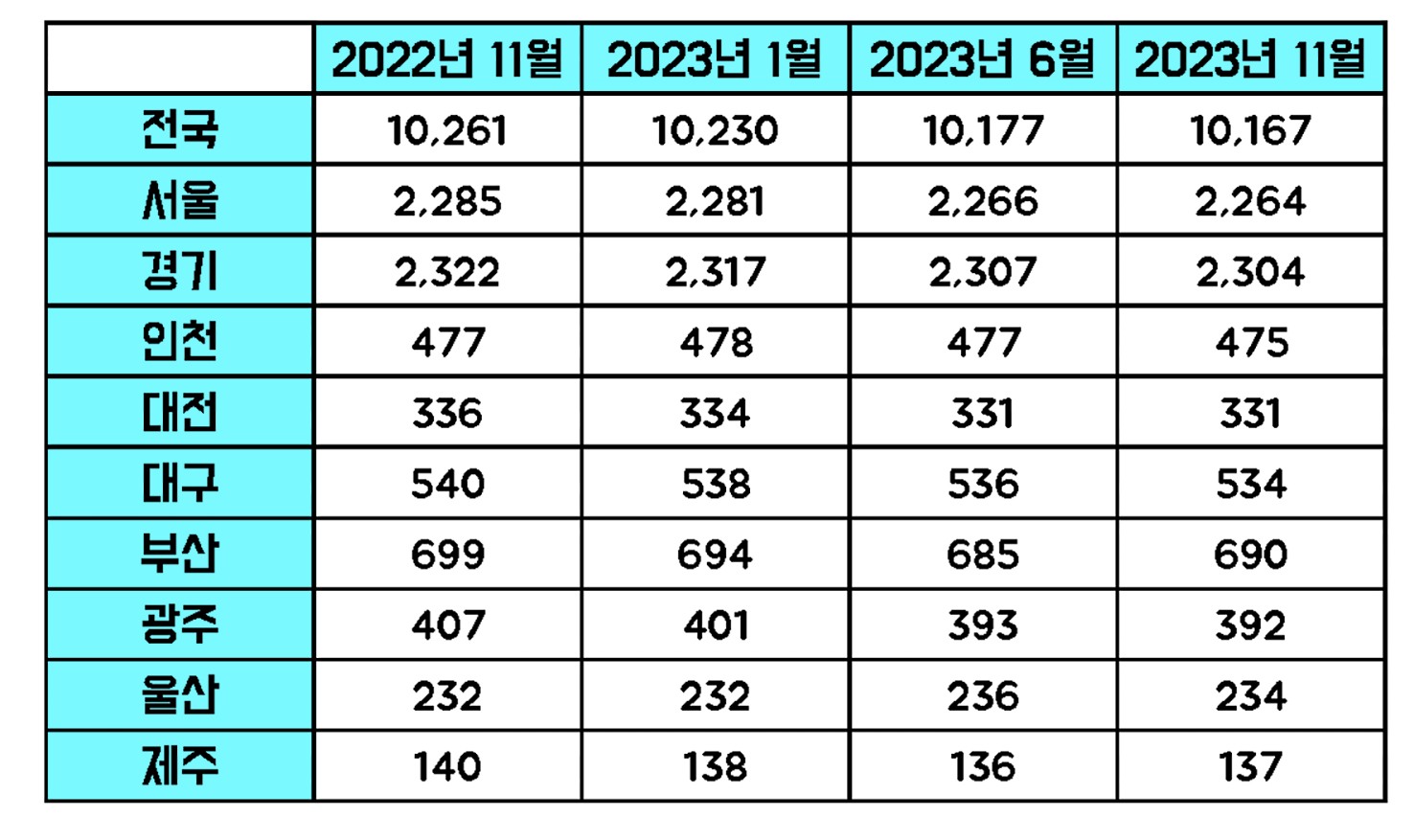 서울의 경우는 2022년 1월 2,285곳에서 2,281곳→2,266곳→2,264곳으로 감소세다. 다른 지역도 마찬가지다. 경기는 2,322곳에서 2,317곳→2,307→2,304 곳이다. 인천은 477곳→478곳→477곳→475곳을, 대전은 336곳→334곳→331곳→331곳을, 대구는 540곳→538곳→536곳→534곳을, 부산은 699곳→694곳→685곳→690곳을 기록했다. 부산의 경우 2023년 6월보다 11월이 증가했지만 1년 전과 비교하면 결국 하락한 것을 알 수 있다. 이어 광주는 407곳→401곳→393곳→392곳으로 앞 자리가 바뀌며 감소했고 제주는 140곳→138곳→136곳→137곳으로 큰 변동은 없는 것으로 보인다. 광역시 중 유일하게 울산만 232곳으로 시작해서 236곳까지 늘었다가 2023년 11월 234곳으로 줄었지만 1년 전보다는 증가한 수치다.