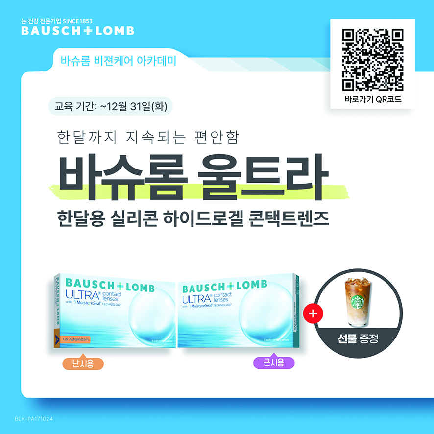 온라인 클래스는 12월31일까지 바슈롬 아카데미 교육사이트에서 참여할 수 있으며, 교육 기간 내에 수료한 모든 안경사에게는 스타벅스 커피 모바일 쿠폰을 증정하는 특별 이벤트도 함께 진행될 예정이다.