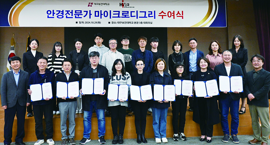 대구보건대학교(총장 남성희) Hi-FiVE HiVE센터 안광학사업단이 지난달 29일 본관 3층 대회의실에서 지역 안경산업 발전과 직업교육 활성화를 위한 ‘안경전문가 마이크로 디그리 수여식’을 개최했다고 최근 밝혔다. 이날 수여식에는 안경전문가 과정을 이수한 재직자 27명과 센터 관계자 등 총 40여명이 참석해 자리를 빛냈다.