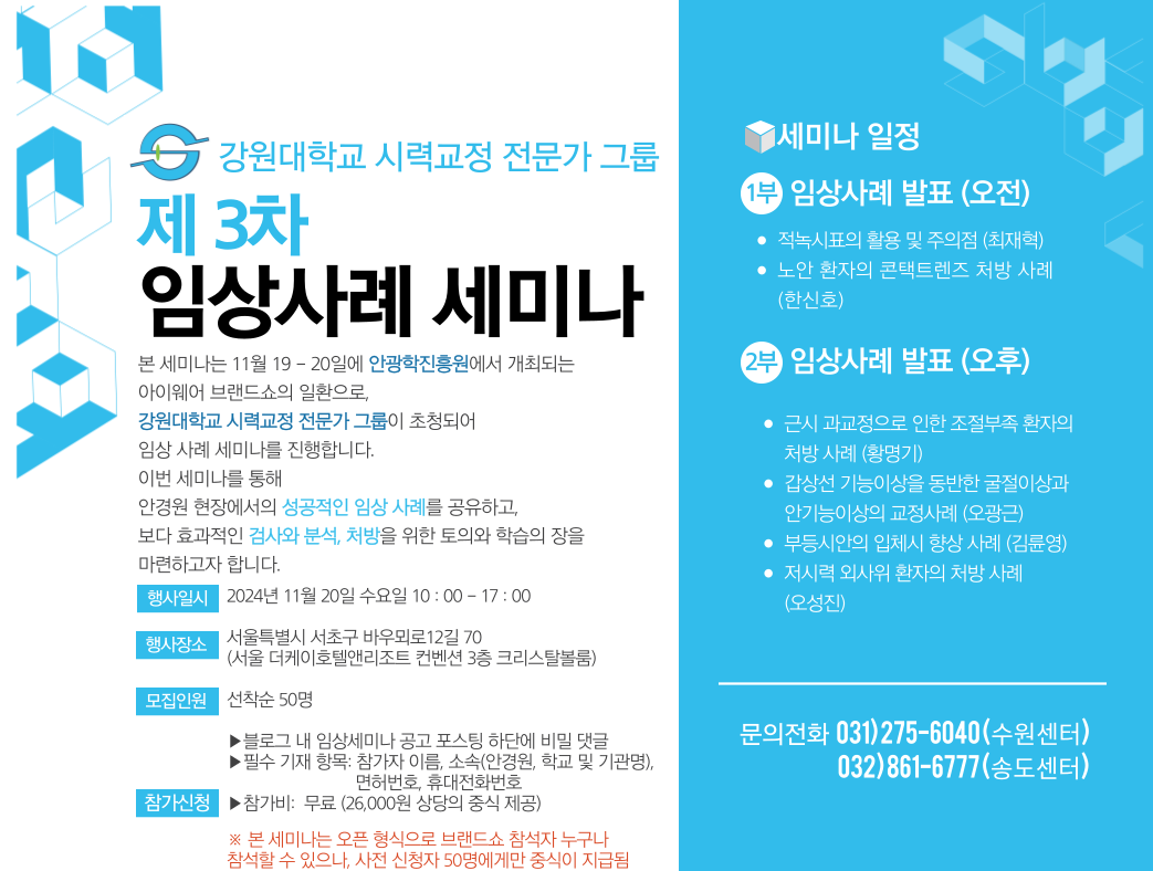 강원대학교 시력교정 전문가그룹이 오는 20일 3차 임상사례 세미나에 참가할 안경사 50명을 선착순으로 모집한다.