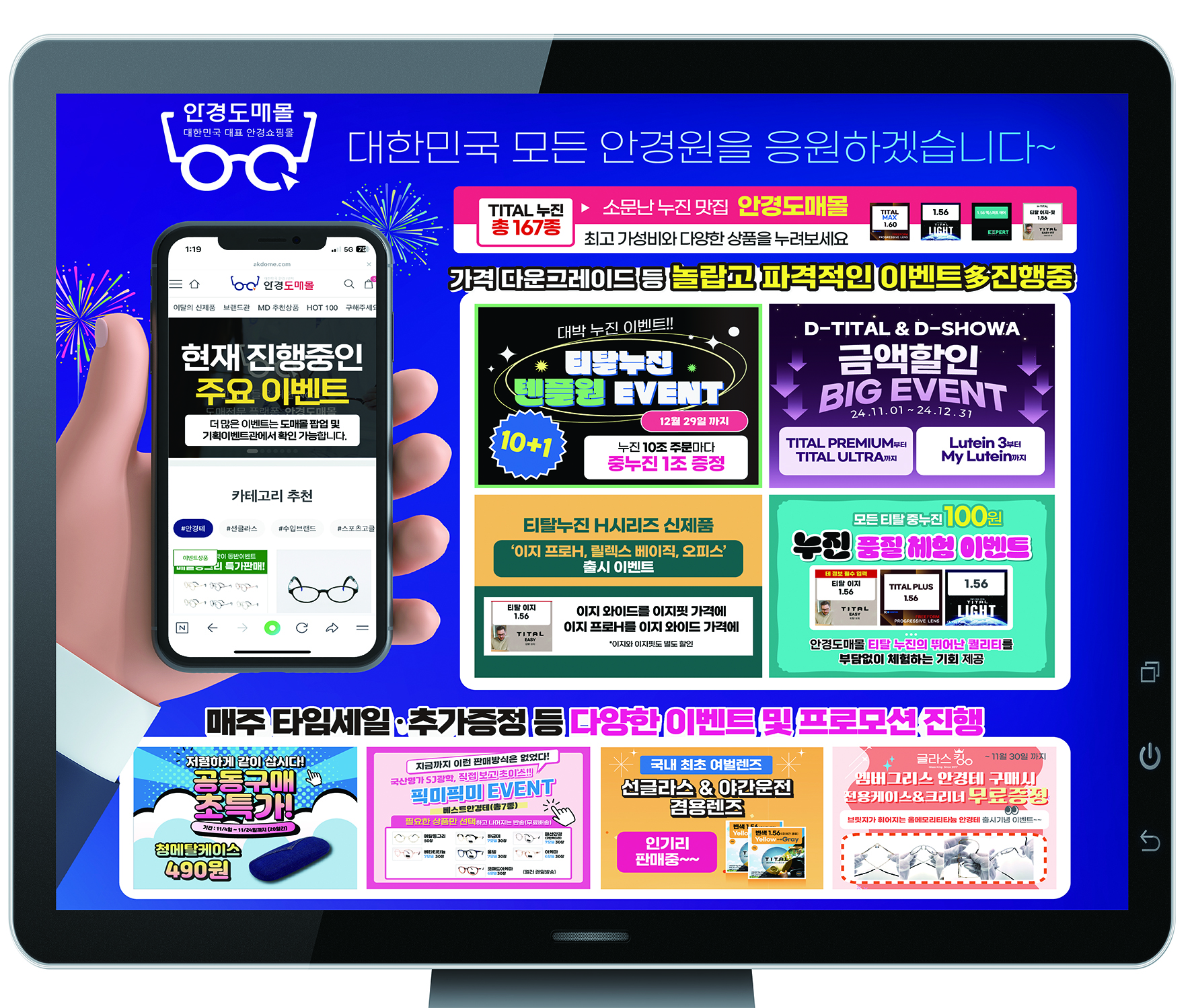 대한민국 대표 안경 B2B 쇼핑몰인 ‘안경도매몰(www.akdome.com)’이 연말을 맞아 누진렌즈 이벤트 4종, 공동구매 할인이벤트, 특가할인 이벤트, 품질체험 이벤트 등 다양한 프로모션을 전개하며 침체된 업계에 큰 활력을 불어넣고 있어 화제다.
