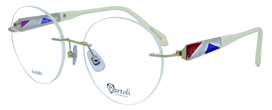 바르톨리 BA6885 col.7 모델은 글리터 장식이 포인트인 패션 무테 제품이다. 템플에 화려하고 반영구적인 글리터 장식은 섬세하게 가공돼 고급스러움이 한껏 묻어난다. 배우 정재순씨가 착용해 화제가 된 모델이기도 하다.