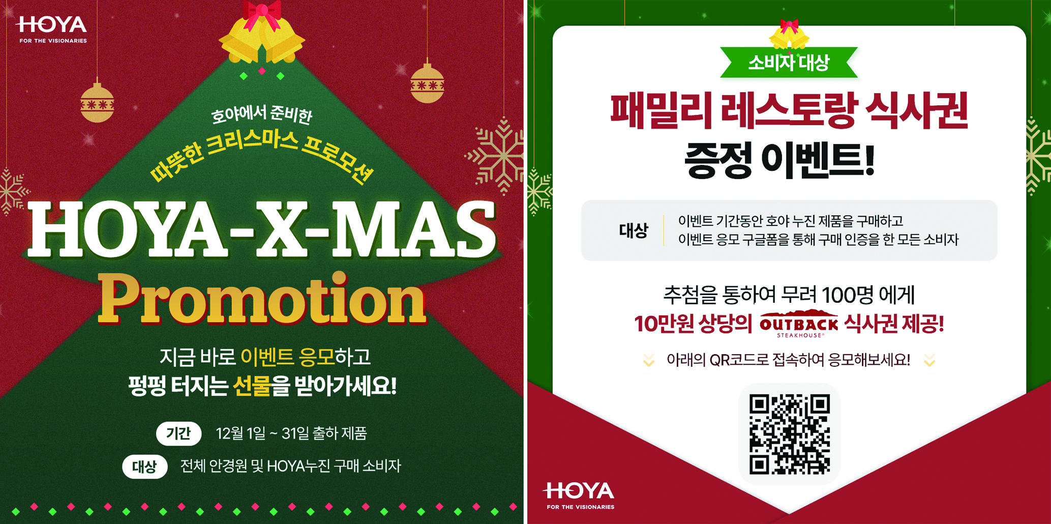 글로벌 안경렌즈 전문 기업 한국호야렌즈(대표 정병헌)가 12월 연말을 맞아 안경원과 소비자를 대상으로 하는 대규모 프로모션인 ‘HOYA-X-MAS Promotion’을 진행한다고 최근 밝혔다. 이번 행사는 안경원 매출 증대를 지원하고 소비자들에게 실질적인 혜택을 제공해 연말 시즌을 더욱 따뜻하게 만들겠다는 취지로 기획됐다.