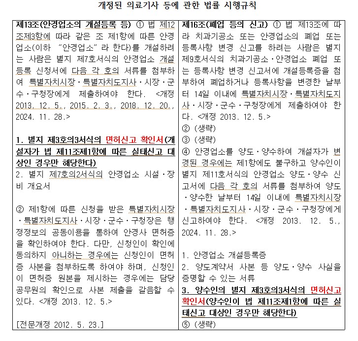 변경된 ‘의료기사 등에 관한 법률 시행규칙’이 지난달 28일부터 보건복지부령 제1072호로 시행됨에 따라 안경원 개설 등록 및 양도·양수 시 면허신고 확인서 제출이 의무화 됐다.