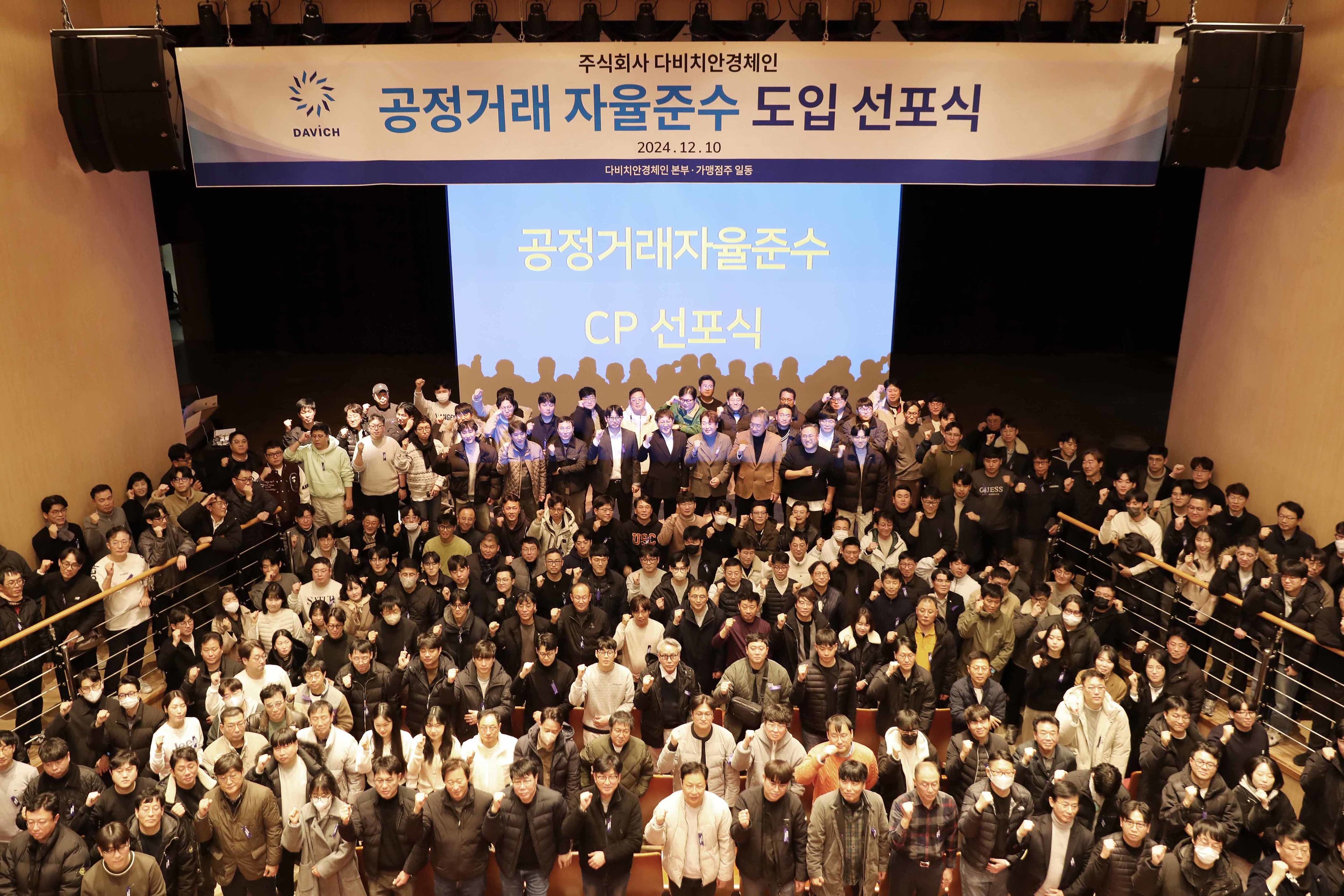 이번 다비치안경 CP 선포식에는 약 300여개 가맹점주들과 본사 직원들이 참석해 준법 경영에 대한 전사적인 공감대를 형성하고 공정거래 법규 준수를 약속했다. 이에 다비치안경은 앞으로 신규 입사자 교육부터 재직자 대상 교육, 공정거래 자율준수 편람 배포는 물론 CP에 따른 업무 절차 수립 및 모니터링 등을 통해 조직 내 공정거래 자율 준수 문화를 조성해 나갈 예정이다. 또한 가맹본부와 가맹사업자 간 협약서 작성을 통해 투명한 경영도 약속했다.