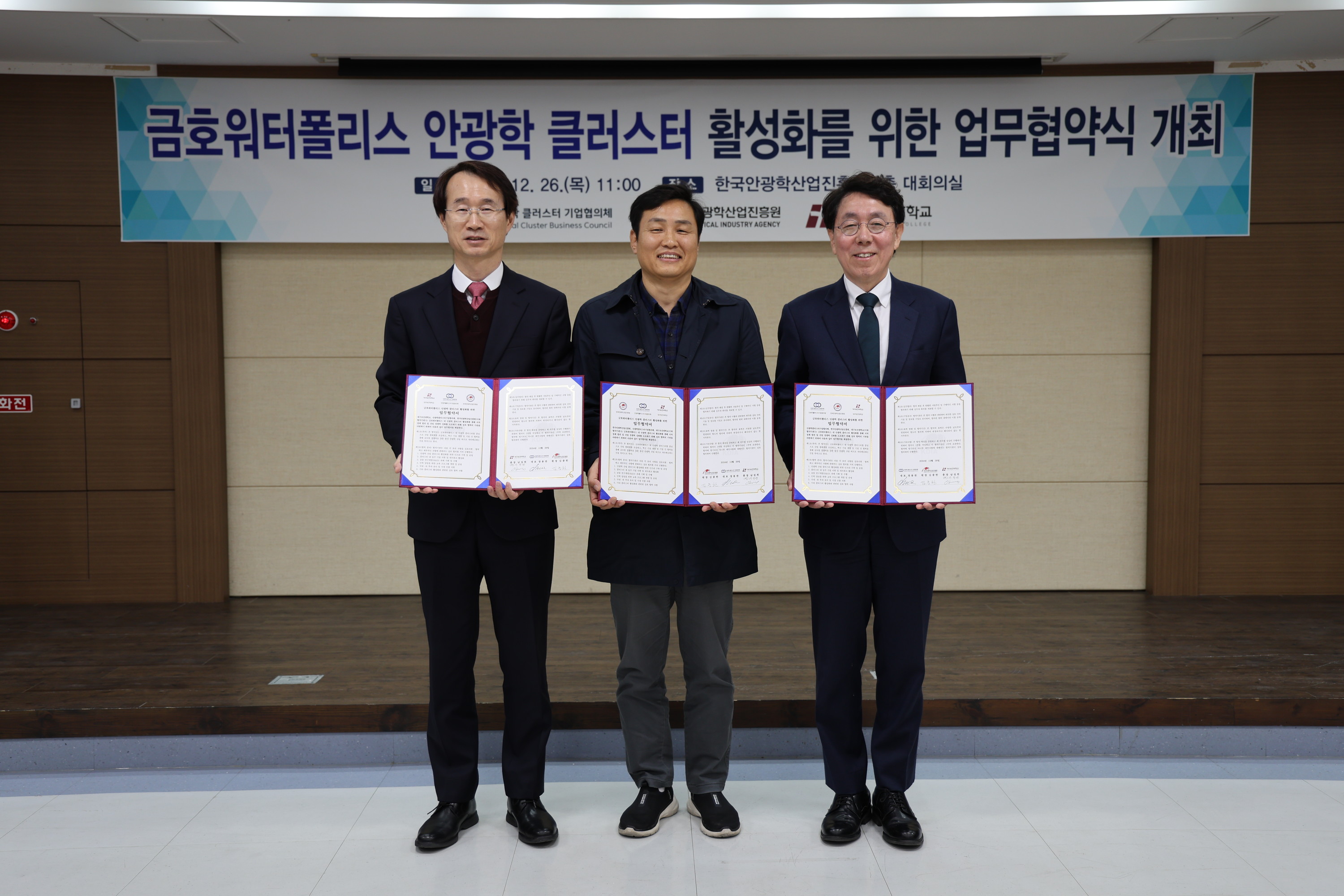 한국안광학산업진흥원(원장 김종한·이하 진흥원)은 지난 12월 26일 안광학클러스터기업협의체(대표 장용찬), 대구보건대학교(총장 남성희)와 대구 북구 검단동 일대에 조성 중인 금호워터폴리스 안광학 클러스터를 활성화하고 지역 경제 발전 및 산업 경쟁력 강화 기반을 마련하기 위해 업무협약(MOU)을 체결했다고 최근 밝혔다.