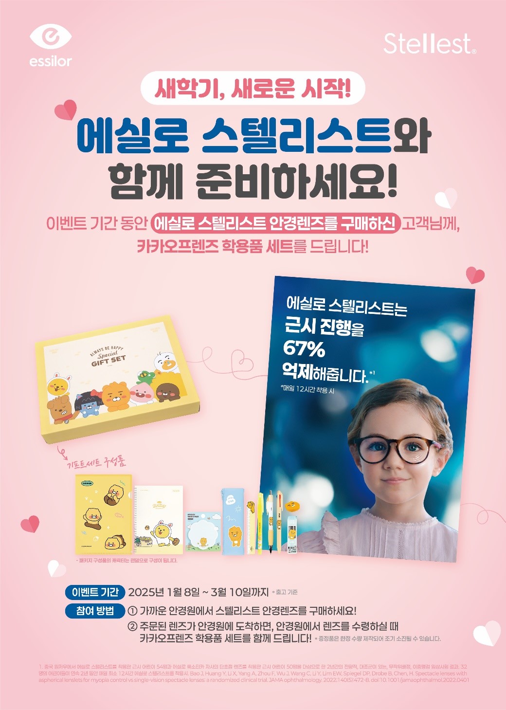 글로벌 안경렌즈 전문 기업 에실로코리아(대표 소효순)가 근시 진행 억제 안경렌즈인 ‘에실로 스텔리스트’ 구매 시 카카오프렌즈 학용품 세트 증정 이벤트를 진행한다고 최근 밝혔다. 해당 이벤트는 새 학기를 맞이하는 아이들을 위한 것으로 1월 8일부터 3월 10일까지 진행된다. 해당 기간은 안경렌즈 출고일을 기준으로 한다.