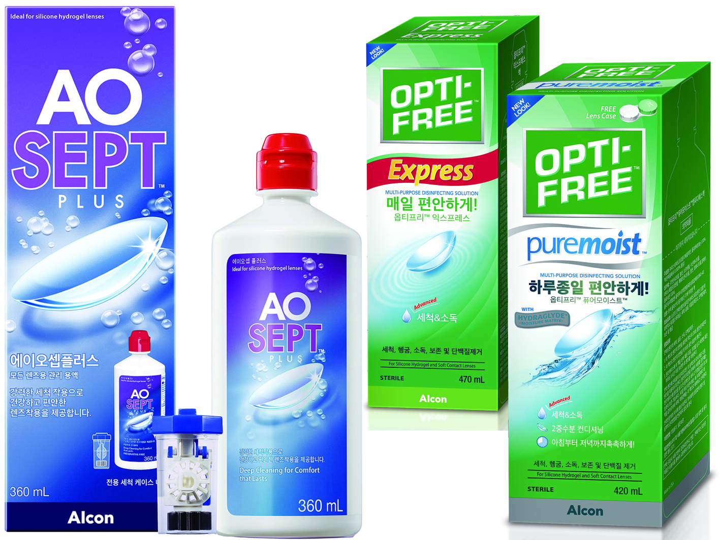 한국알콘에서는 현재 다목적 관리용액으로 옵티프리와 에이오셉 등 두 가지 제품을 선보이고 있다. 다목적 관리용액은 흔히 렌즈를 보관하는 것에만 끝나는 것이 아니라 단백질, 미세먼지, 이물질 등을 제거하는 3중 세척에 더욱 중점을 둔다.
