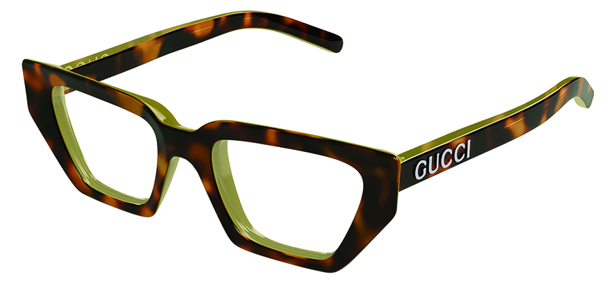 구찌 GG1720O 모델은 캣아이 실루엣의 옵티컬 안경으로, 각면 처리가 됐으며 직선형 템플에는 래커 처리를 한 구찌 로고가 각인되어 있다.