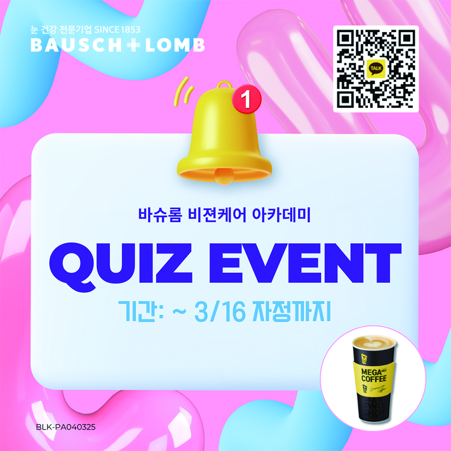 이번 퀴즈 이벤트는 바슈롬 안경사 전용 카카오톡 채널인 ‘바슈롬비젼케어아카데미’를 통해 진행된다. 채널을 통해 3월 12일(수) 오전에 발송되는 알림톡을 통해 참여할 수 있으며, 미리 카카오채널 친구 추가를 하면 쉽고 빠르게 참여할 수 있다.