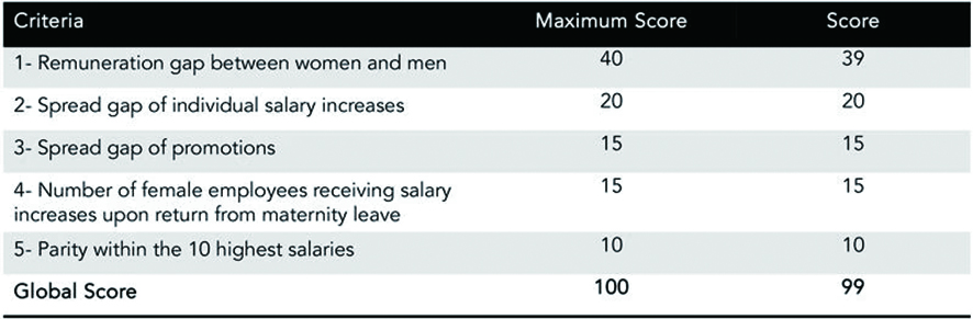 프랑스 내 직원 50명 이상의 기업은 매년 3월 1일까지 성평등 점수를 산출해 제출해야 한다. 성평등 지수의 5가지 주요 기준은 기업내 여성과 남성의 보수 격차, 개인별 급여 인상률 격차 확대, 승진 격차, 육아휴직 복귀 시 급여 인상을 받는 여성 직원 수, 최고 연봉 상위 10명 내 평등도 등이다.