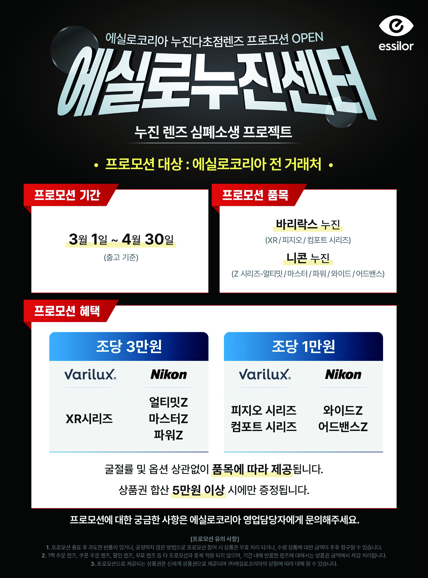에실로코리아 프리미엄 누진렌즈인 바리락스 XR시리즈와 니콘 씨맥스 얼티밋Z(SEEMAX Ultimate Z), 씨맥스 마스터Z(SEEMAX Master Z), 프레지오 파워Z(Presio Power Z)를 판매한 안경원에는 조당 3만원의 상품권을 지급한다.