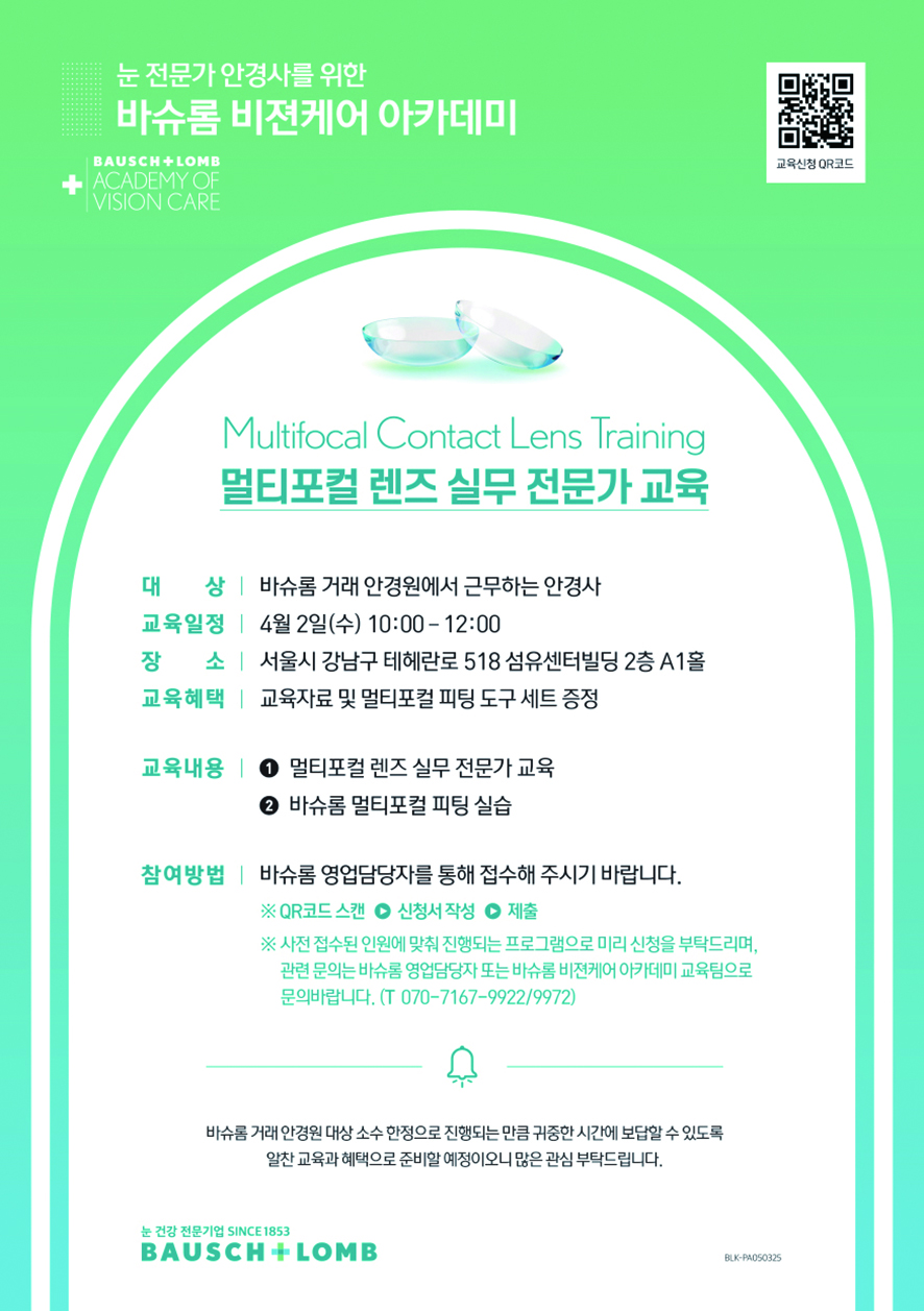 바슈롬 비젼케어 아카데미가 내달 2일(수) 오전 10시부터 오후 12시까지 서울에서 멀티포컬 관련 오프라인 교육을 진행한다고 최근 밝혔다. 이번 교육 주제는 ‘멀티포컬 렌즈’로 실무에 바로 적용할 수 있는 처방 사례를 중점적으로 다룰 예정이다.