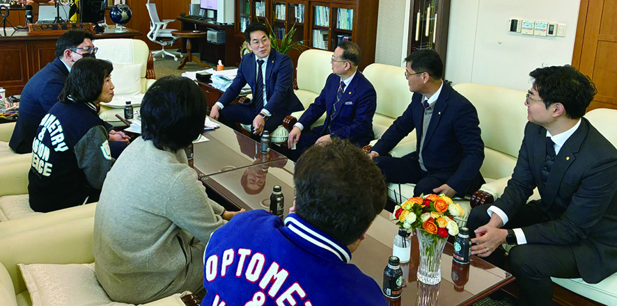 특강 후에는 동남보건대학교 김종완 총장 및 학교 관계자들과 면담이 진행됐다. 이 자리에서 허 협회장은 안경사 전문성 강화 및 국내 안보건 환경 향상을 위해 안경광학과 4년제 학제 일원화 필요성을 강조하고, 안경광학과 발전과 학생들 역량 강화를 위해 대학 차원의 적극적인 지원과 관심을 당부했다. 이에 김종완 총장은 허 협회장 의견에 지지를 표명하며 적극적으로 지원하겠다고 화답했다.