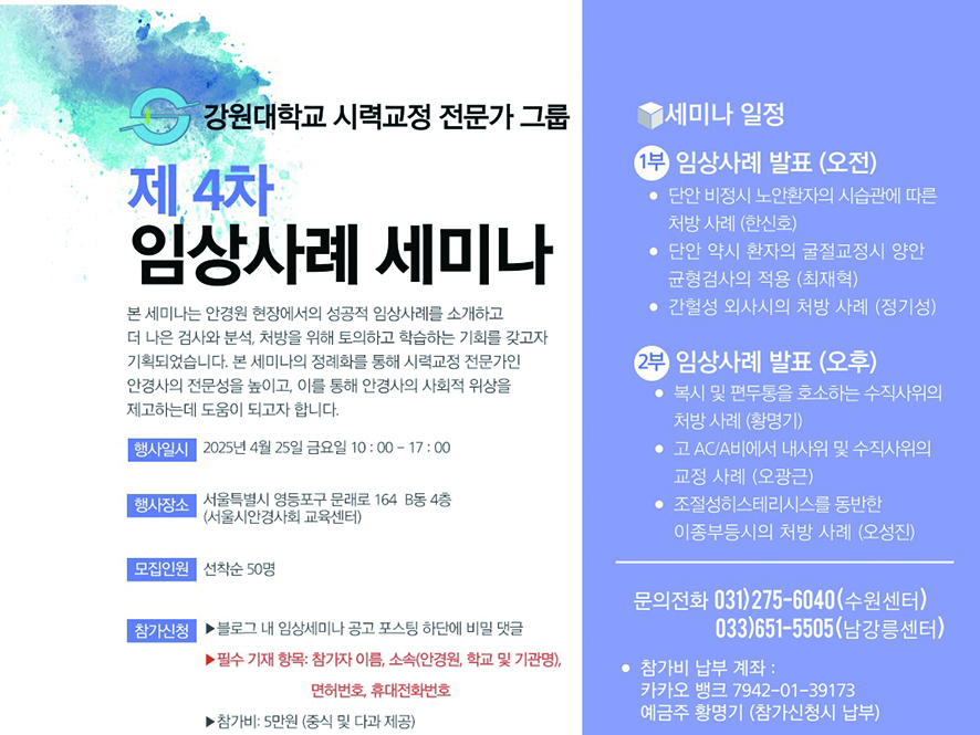 강원대학교 시력교정 전문가 그룹이 오는 25일 제4차 임상사례 세미나에 참가할 안경사 50명을 선착순으로 모집한다. 서울 문래동 서울시안경사회 교육센터에서 진행되는 이번 세미나는 오전 10시부터 오후 5시까지 진행된다.