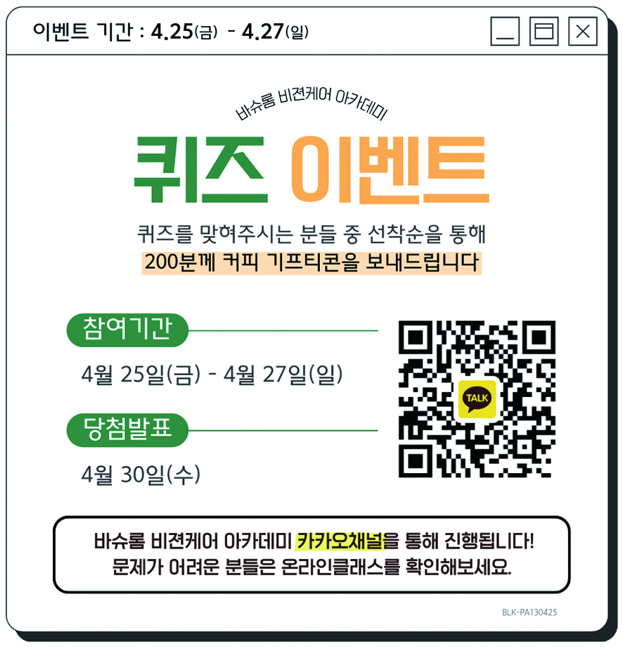 이번 이벤트는 바슈롬 안경사 전용 카카오톡 채널인 ‘바슈롬비젼케어아카데미’를 통해 진행된다. 채널을 통해 4월 25일 오전에 발송되는 알림톡을 통해 참여할 수 있으므로, 미리 카카오채널 친구 추가를 하면 쉽고 빠르게 참여할 수 있다.