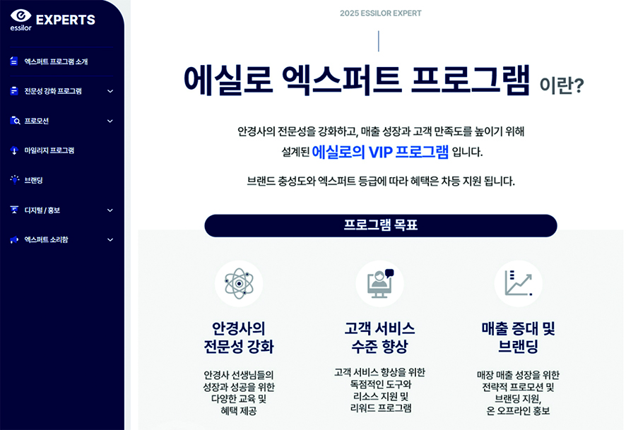 에실로코리아(대표 소효순)가 ‘에실로 엑스퍼트(Essilor EXPERTS)’ 전용 웹 페이지를 신규 개설하고, B2B 파트너 대상 서비스를 강화한다.