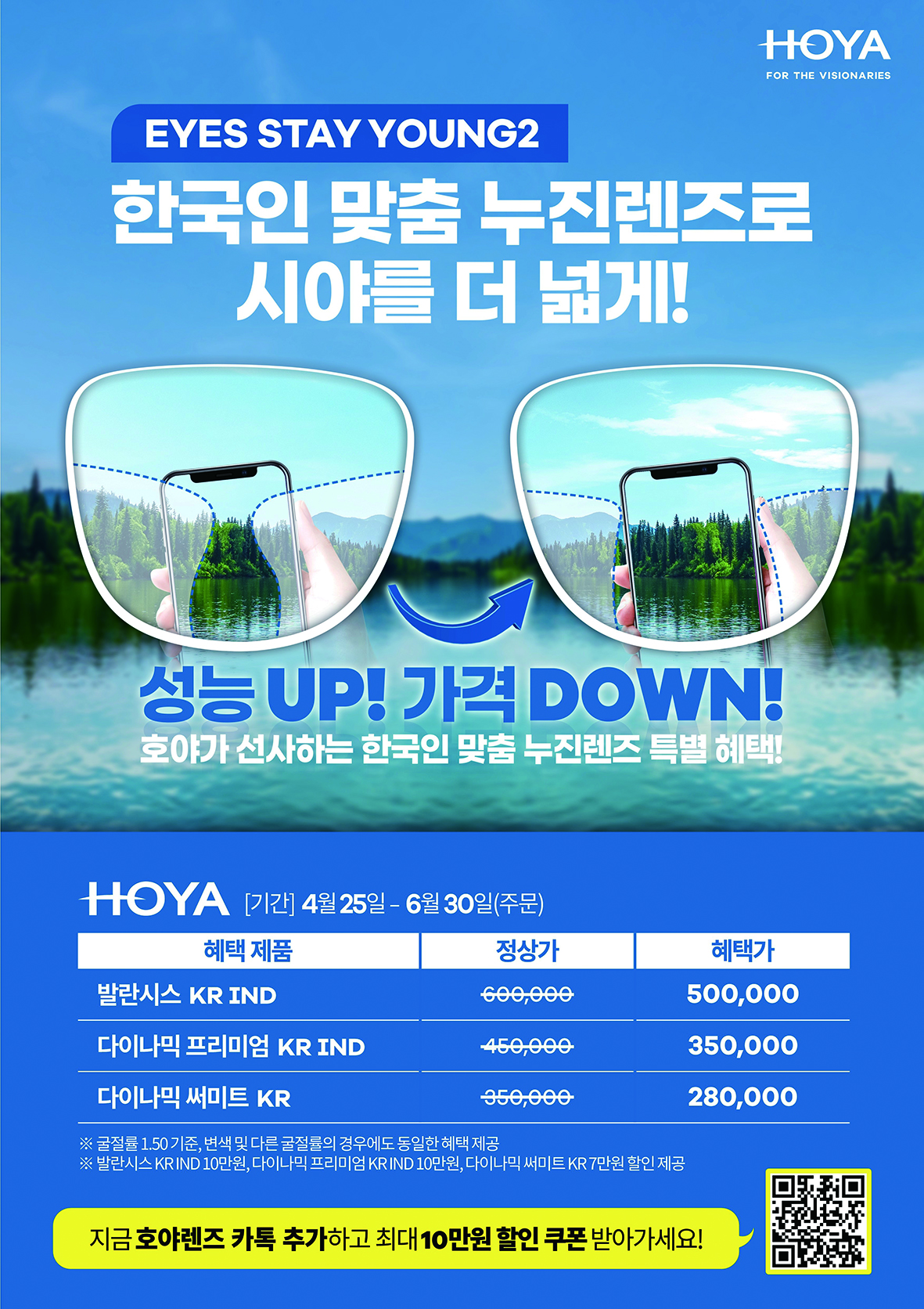 한국호야렌즈(대표 정병헌)가 이달 25일부터 6월 30일까지 누진다초점렌즈 할인 혜택을 제공하는 ‘EYES STAY YOUNG2’ 캠페인을 진행한다고 최근 밝혔다.