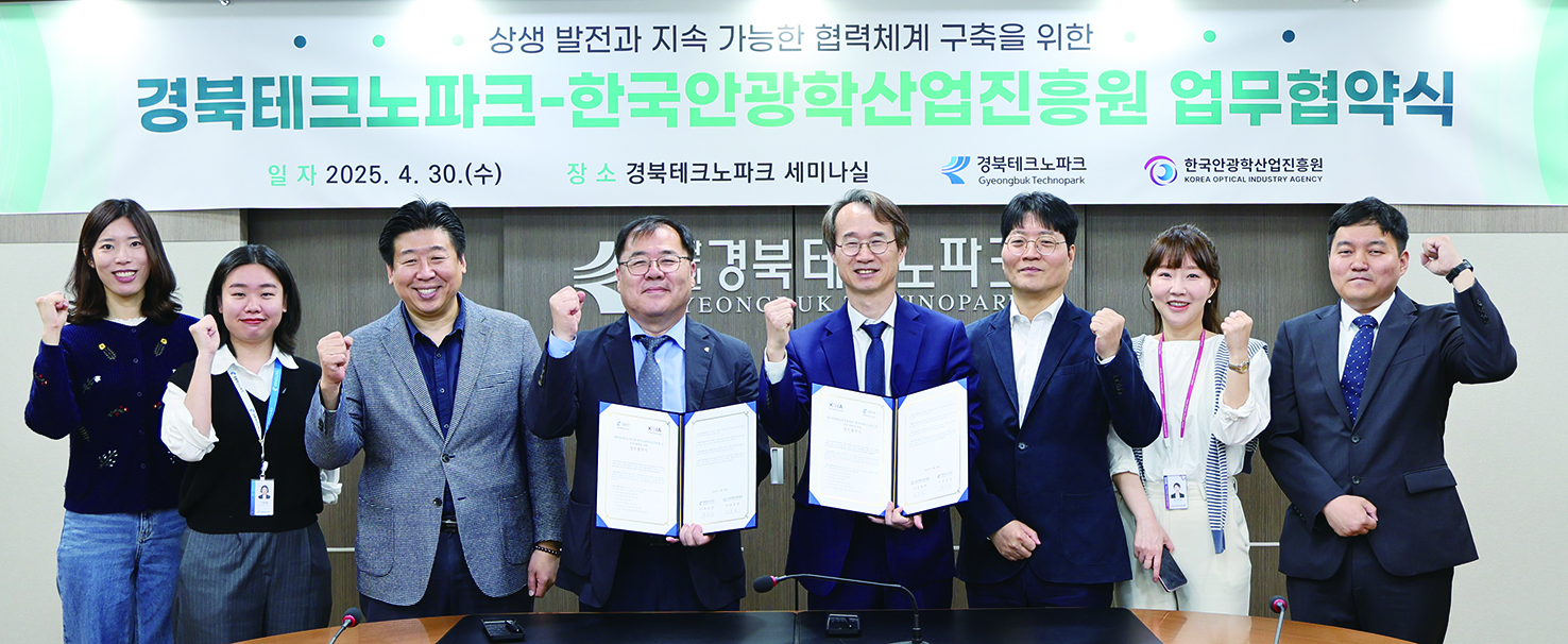 한국안광학산업진흥원(원장 김종한·이하 진흥원)과 경북테크노파크(원장 하인성)가 지난 4월 30일 경북테크노파크 세미나실에서 지역 안광학산업 및 지역산업 경쟁력 강화를 위한 업무협약(MOU)을 체결했다.