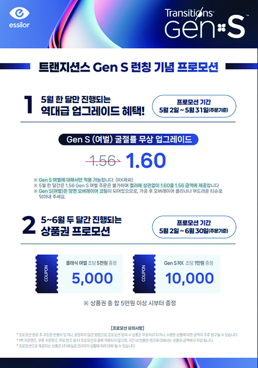 에실로코리아는 ‘트랜지션스 Gen S’ 출시를 기념해 안경원을 대상으로 다양한 프로모션도 진행한다. 5월 2일부터 31일까지 Gen S 여벌 제품 구매 시 굴절률 1.56 렌즈를 1.60 렌즈로 무상 업그레이드하는 혜택을 제공한다. 또 6월 30일까지 두 달간 트랜지션스 클래식 제품 주문 시 조당 5천원, Gen S RX 제품 주문 시 조당 1만원 상품권을 증정한다.