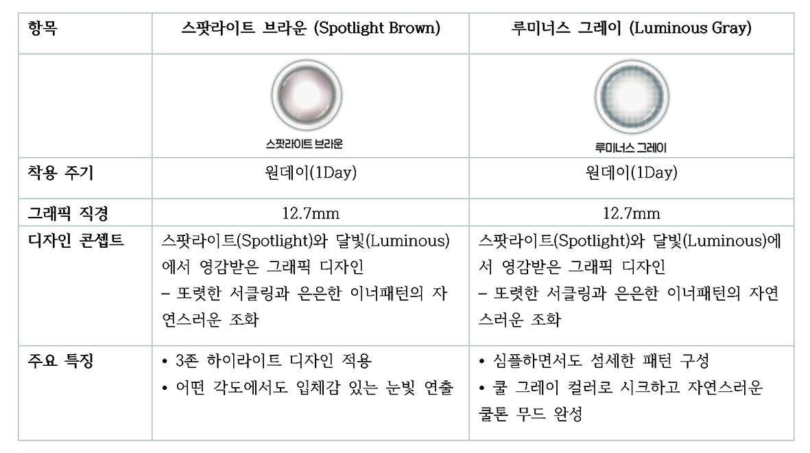또 정교한 디자인으로 착용시 자연스럽고 매력적인 눈빛 연출이 가능하며, 부드럽게 믹스된 투톤의 컬러로 눈동자를 영롱하게 만드는 것이 큰 특징이다.