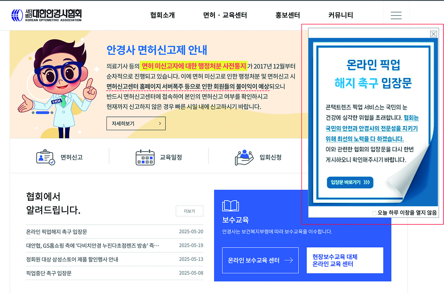대안협은 또 “일곱째, 픽업에 가담하고 있는 일부 안경사들은 면허를 유지하기 위한 기본적인 법적 의무조차 지키지 않고 있다. 하물며 10년 이상 보수교육 미이수, 면허 미신고 등 법적 자격요건을 충족하지 못한 이들이 안경사 명의를 이용해 픽업에 가담하고 있으며, 이는 현행법 위반 소지가 있음은 물론, 안경사 직역 전체에 대한 신뢰를 훼손하는 심각한 윤리적 문제다. 법적 자격조차 유지하지 않는 이들이 소비자 앞에 ‘안경사’라는 이름으로 서는 것 자체가 업계의 근간을 흔드는 행위”라고 못박았다.