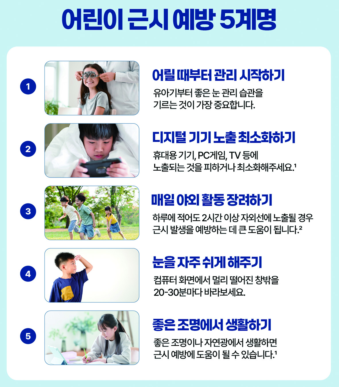 에실로코리아는 가정에서 실천할 수 있는 눈 건강 수칙으로 ‘어린이 근시 예방 5계명’을 소개했다. △유아기부터 시작하는 정기적인 시력 검진 △PC, TV, 스마트폰 등 디지털 기기 노출 최소화 △매일 2시간 이상의 야외활동 장려 △독서 및 학습 시 20~30분마다 눈 휴식 △밝고 균일한 조명에서 생활하는 것 등이 핵심이다. 보다 자세한 실천법은 ‘에실로 스텔리스트’ 공식 블로그에서 확인할 수 있다.