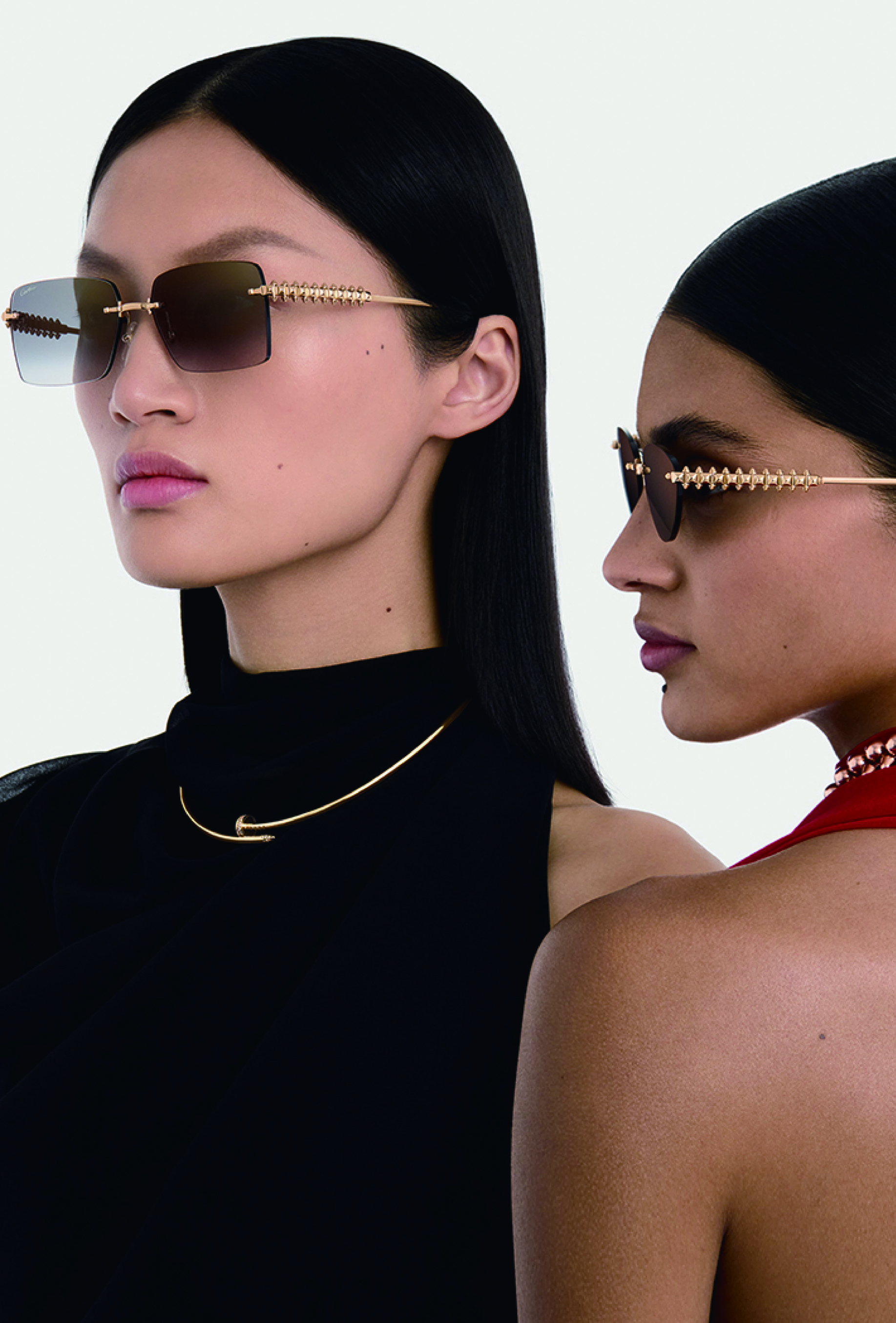 장인의 정교한 기술로 완성된 아이웨어 프레임은 브랜드의 상징적인 디자인 요소를 반영하고 있다. 특히 크리에이티브 디렉터였던 잔 투생(Jeanne Toussaint)이 클래쉬 드 까르띠에 쥬얼리를 통해 선보인 시그니처 스터드 디테일이 더해졌다.